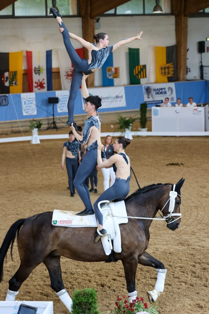Kaum waren die Voltigierer des Team Norka des VV Köln Dünnwald zurück von den Europameisterschaften ging es schon zum nächsten wichtigen Event. Und auch hier zeigten sie ihre gute Form. Auf dem Rücken von Ecuador, der auch in Aachen und bei den Europameisterschaften seinen Teil zum Erfolg beitragen konnte, turnten Giana Ronca, Philip Goroncy, Larina Herpetz, Marie Ronca, Fabio Ring und Bela Lehnen zum unangefochtenen Sieg. An der Longe freute sich Alexandra Knauf über die guten Leistungen ihres Teams. Erneut knackte die Gruppe mit ihrer Gesamtpunktzahl die 9er Marke und ließ der Konkurrenz damit keine Chance. Auf Rang vier verpassten die Voltigierer aus Neuss eine Medaille nur knapp. Madita Huckriede, Lucia Gerdits, Elias Hartenstein, Lina Hofmeyer, Laetitia Popp und Fynn Bading turnten auf dem Rücken von Calypso, den Stefanie Eggink an der Longe hatte. Ein zweites Eisen hatten die Kölner mit der Gruppe VV Köln Dünnwald III im Feuer. Finja Wandelmann, Pauline Eyhussen, Vivien Fuchs, Alina Meizl, Felix Diegel und Marleen Adam wurden auf dem Zirkel von Ready to take off und Sarah Krauß begleitet und platzierten sich an sechster Stelle.